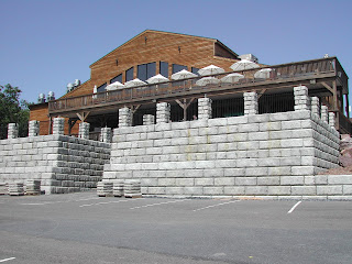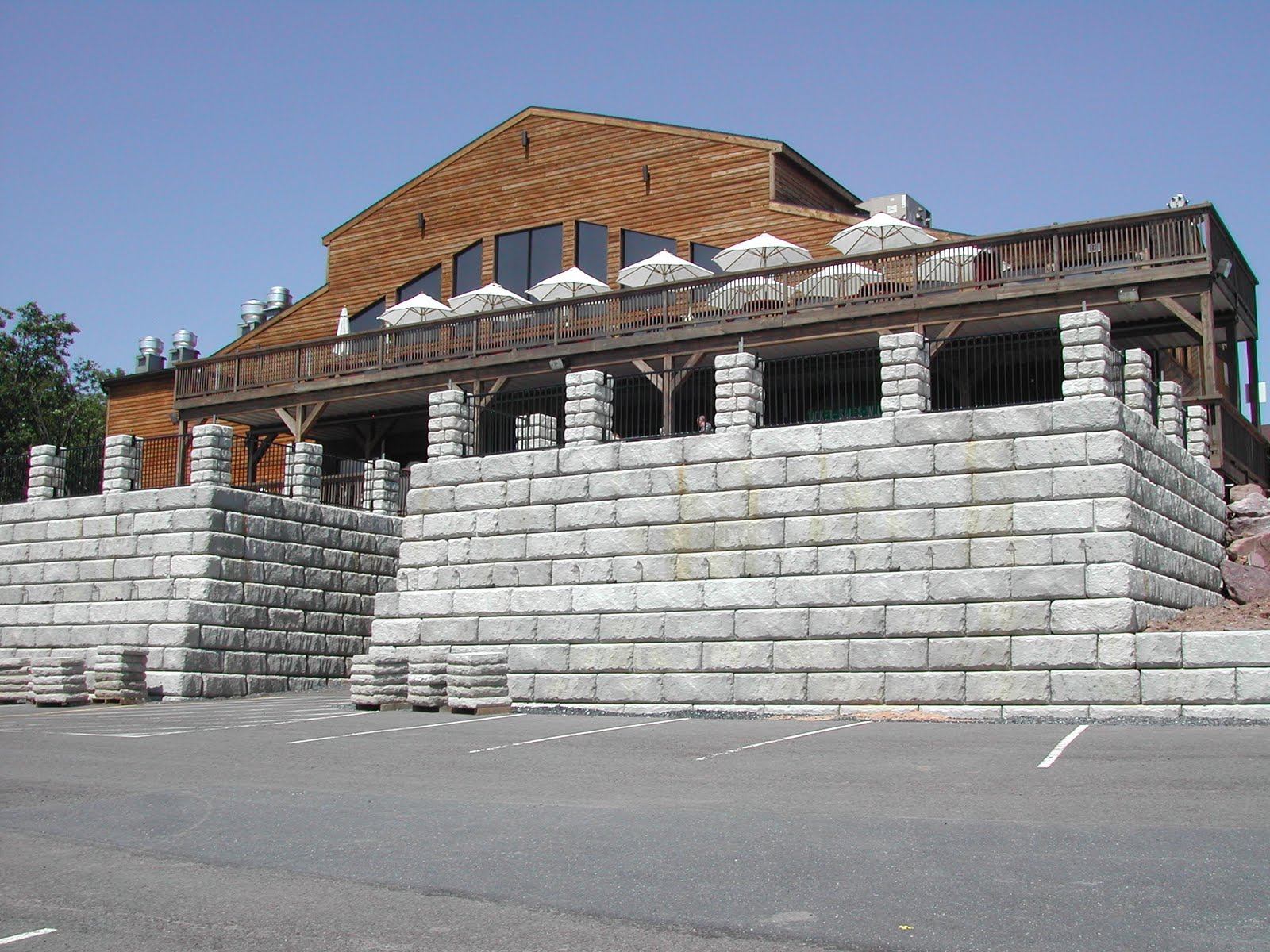 The purpose of these two Redi-Rock features is to enclose a water tank for a fire suppression system and give extra patio space for guests to enjoy.